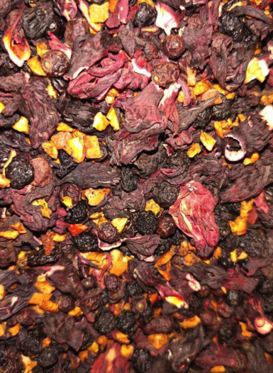 Каркадэ, яблоко, папайя, шиповник, вишня, боярышник, изюм, аромамасла.