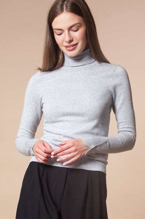 Состав: 80%Хлопок 20%ПАСвитер по фигуре. Если нужна свобода облегания рекомендуем на размер больше.На первый взгляд базовая водолазка. Но фишкой модели являются эффектные манжеты с разрезом, украшенные золотистыми заклепками. Выполнено их хлопка с нейлоном. Натуральный состав гарантирует безупречный комфорт при любой погоде, а нейлон обеспечивает формоустойчивость изделия и стойкость цвета.