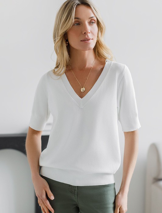 Состав: 83%Вис 17%ПА Плотность: 12 GG Параметры модели на первом фото: Рост 172, бюст 88, талия 64, бедра 88 Размер товара на первом фото: 42Джемпер тонкой вязки выполнен из вискозы с нейлоном. Модель с V-вырезом свободного силуэта. Мягкая очень приятная к коже пряжа не колется, хорошо держит форму и гарантирует комфорт во время носки в течение всего дня. Изделие дополнено фирменным металлическим логотипом бренда.