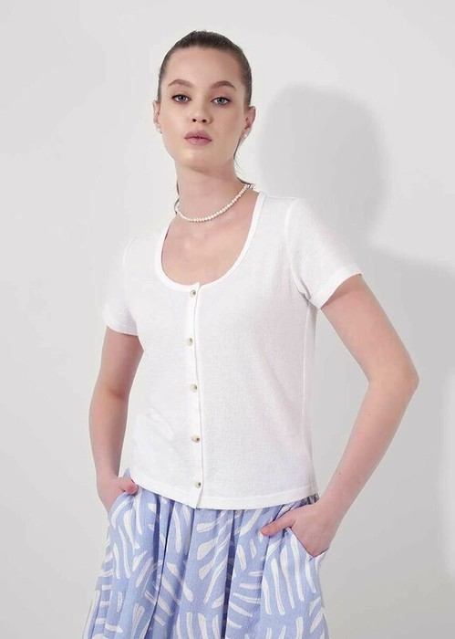 Джемпер прямого силуэта из фактурного трикотажного полотна джерси. Округлая горловина с окантовкой. По борту нефункциональная планка с пуговицами. Короткий втачной рукав.