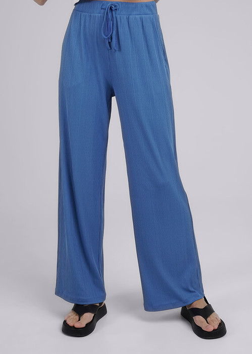 Брюки широкие из трикотажного полотна. По талии отрезной пояс на резинке с завязками. Боковые карманы с отрезным бочком.