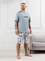 Комплект мужской состоящий из футболки и брюк. Футболка из трикотажного полотна в набивку с коротким рукавом и дизайнерской нашивкой. Брюки из трикотажного полотна на широком поясе с резинкой и регулируемым шнуром, по бокам удобные карманы.