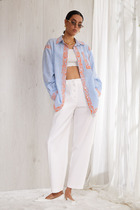 Блузка из текстильного полотна лен с вискозой,прямого силуэта. Длинный рукав со спущенной линией плеча, по низу манжет с разрезом. По борту цельновыкроенная планка с застежкой на пуговицы, по горловине отложной воротник со стойкой. По бокам разрезы.