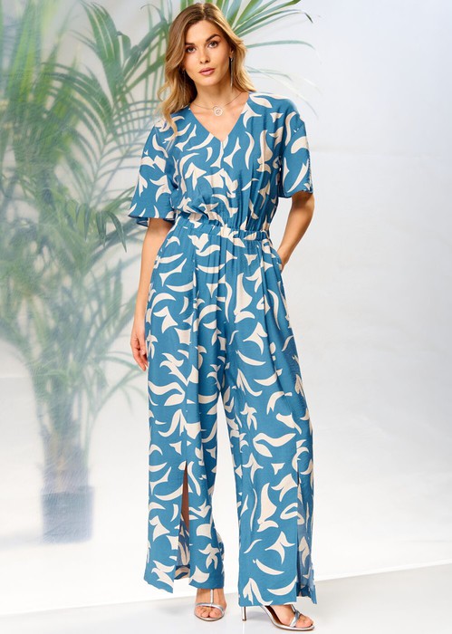 Комбинезон женский из штапеля, свободного силуэта, со спущенной линией плеча, с втачным поясом на уровне линии талии, в который вставлена эластичная тесьма. Лиф детали переда комбинезона со средним швом, на уровне талии обработаны 2 складки. Нижние части с рельефными швами, которые заканчиваются разрезами, в боковых швах обработаны наклонные карманы. Лиф детали спинки комбинезона с запахом, вверху которого обработан разрез с застежкой на 1 навесную петлю и пуговицу, по середине застежка на 1 потайную кнопку. На нижней части по шву притачивания пояса обработаны по одной вытачке на каждой половинке. Рукава втачные двухшовные, короткие, с разрезами. Вырез горловины комбинезона «V-образной» формы, обработан обтачкой.
