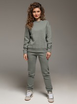 Костюм молодежный из трикотажного гладкокрашенного полотна «еврофлис», Джемпер - свободного покроя, с длинными втачными рукавами, нижние срезы которых обработаны эластичной тесьмой, воротником-стойкой и карманами в рельефных швах. Полочка - с отрезной кокеткой из двух частей, с застежкой "молния", обработанной в соединительном шве. Низ изделия с подгибкой и регулируется по ширине с помощью фиксатора.Брюки – длинные, полуприлегающего силуэта, на поясе с эластичной тесьмой внутри и карманами в боковых швах. Передние половины застрочены по центральным линиям.