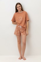 Пижама молодежная из штапельного полотна с набивным рисунком в комбинации мелкого рисунка с аналогичным, но более крупным, состоящая их майки-топа и шорт. Майка-топ – из штапельного полотна с крупным набивным рисунком, свободного покроя, слегка расширенная книзу, на узких бретелях. На полочках – вытачки в области груди. Вырез горловины и проймы окантованы основным материалом. Для регулирования бретелей по длине предусмотрены пластмассовые пряжки и кольца – держатели, устанавливаемые на бретелях. Шорты – из штапельного полотна с более мелким набивным рисунком, свободного покроя, средней длины, на широком притачном поясе с эластичной тесьмой внутри.