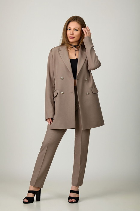 Брючный комплект из костюмной ткани на подкладке. Жакет двубортный. Воротник-с отложными лацканами пиджачного типа, рукава - двухшовные. Карманы прорезные с клапанами. Жакет застегивается на две основные пуговицы, одну потайную. Брюки слегка заужены к низу, с двумя наклонными карманами и притачным поясом. Величина пояса регулируется резинкой. Застегиваются на молнию по переду и одну пуговицу.