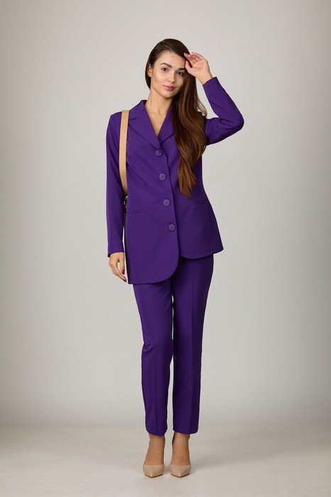 Стильная брючная пара из костюмной ткани на подкладке. Жакет слегка притален, с рельефами по переду и спинке и прорезными карманами с листочками по переду. Воротник-английский, рукава - двухшовные. Низ переда и спинки жакета асимметричен. Шлица на спинке декорирована пуговицами. Жакет застегивается на пуговицы. Брюки слегка заужены к низу, с поясом. Посадка-средняя.Застегиваются на молнию по переду и одну пуговицу.