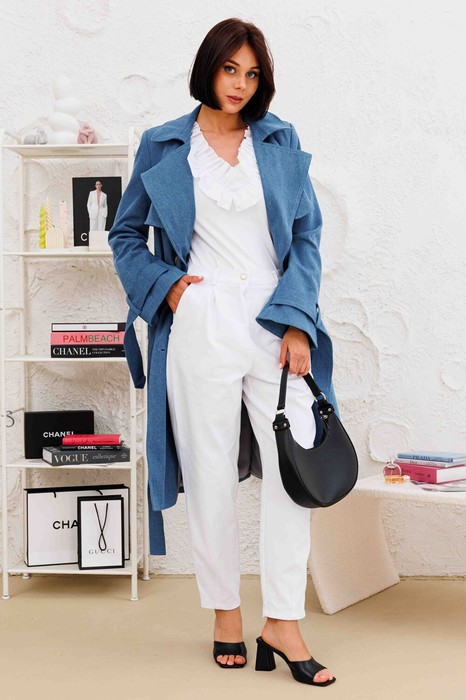 Тренч выполнен из денима, на подкладке. Рукав втачной, к низу расклешенный. По переднем половинкам обработана пелерина. Застежка на пуговицы, сьёмный пояс из основной ткани.