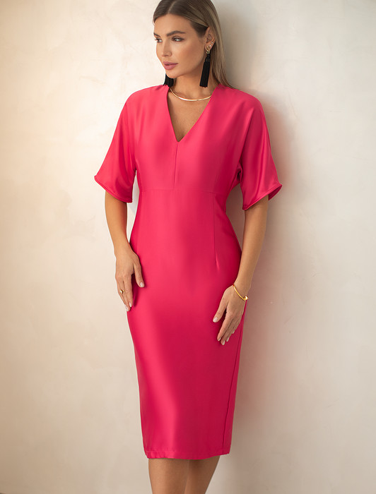 Состав: 69%ПЭ 23%Вис 8%Лиоцелл (Вис) Параметры модели на первом фото: Рост 170, бюст 89, талия 63, бедра 92Платье с глубоким V-вырезом и рукавом «летучая мышь» выполнено из тончайших нитей плотного сатина, плетение которых создает полуматовый блеск, напоминающий натуральный шёлк. Модель с длинными глубокими вытачками спереди и сзади выглядит скульптурно, но за счет струящейся ткани сохраняется плавность силуэта. Ткань почти не мнется и имеет легкий вес. Комфортная длина ниже колена и застежка на молнию.