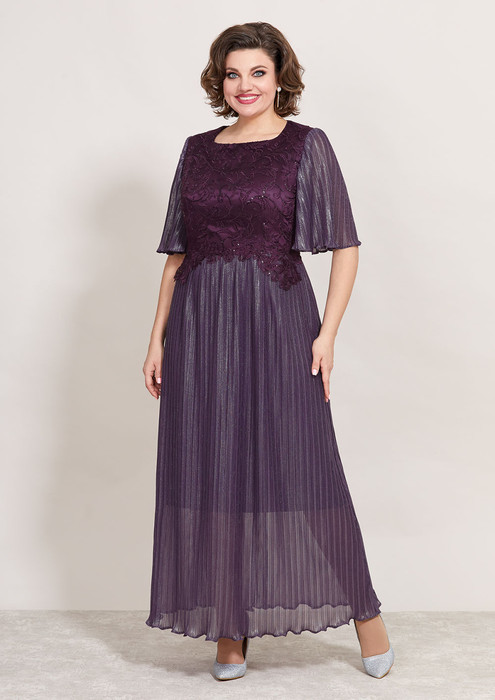 Нарядное платье полу-прилегающего силуэта, выполнено из плиссированной ткани и кружева. Горловина округлой формы, на обтачке, лиф платья отрезной по линии талии, выполнен из кружева, в качестве подкладки атлас. Юбка платья расклешенного силуэта, выполнена из плиссированной ткани, по линии талии аппликация из кружева. Спинка идентична полочке, отрезная по линии талии, верх из кружева, юбка из плиссировки, со средним швом и вытачками, в среднем шве потайная молния. Рукав втачной, расклешенный, оптимальной длины, выполнен из плиссировки. Эффектное, нарядное платье прекрасный выбор для торжественных мероприятий!