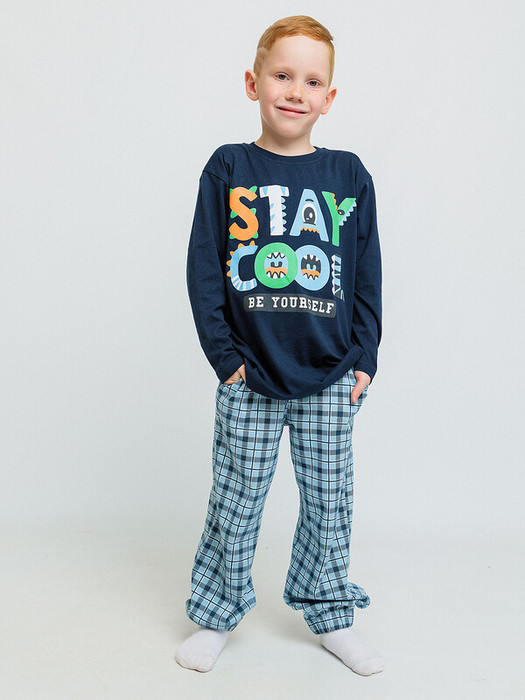 Пижама для мальчика трикотажная: футболка с длинным рукавом и брюки. Качественная гипоаллергенная ткань 100% хлопок, аккуратные швы, стильная расцветка. Футболка синяя с принтом в виде надписи, брюки свободного кроя в клетку.Характеристики:Ткань: Супрем пенье 100% хлопокПроизводитель: batik