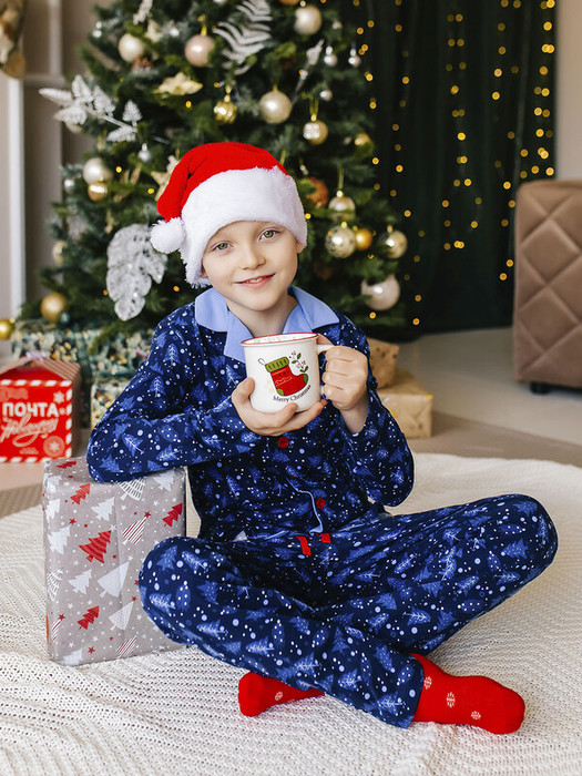 Пижама детская синяя с принтом "елочки". Красивая зимняя пижама из новой новогодней коллекции трикотажа от Батик. В комплект входит футболка и брюки.Особенности:Футболка на пуговицах с отложным воротникомДлинные рукаваБрюки на резинкеХарактеристики:Материал: 92% хлопок, 8% эластанРазмеры: 98-140Производитель: batik