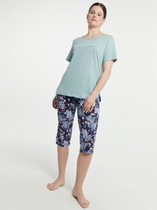 Комплект для сна и отдыха из меланжевого трикотажа. Удлиненная футболка комфортно садится по фигуре.  Бриджи из набивного трикотажа с добавлением лайкры с мягким поясом на резинке.