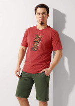 Костюм мужской, состоящий из футболки и шорт. Футболка - свободного покроя, короткими втачными рукавами и горловиной овальной формы, обработанной втачной планкой. По шву втачивания планки настрочена двойная отделочная строчка. Шорты - удлиненные, с карманами в боковых швах, на притачном поясе с эластичной тесьмой внутри.