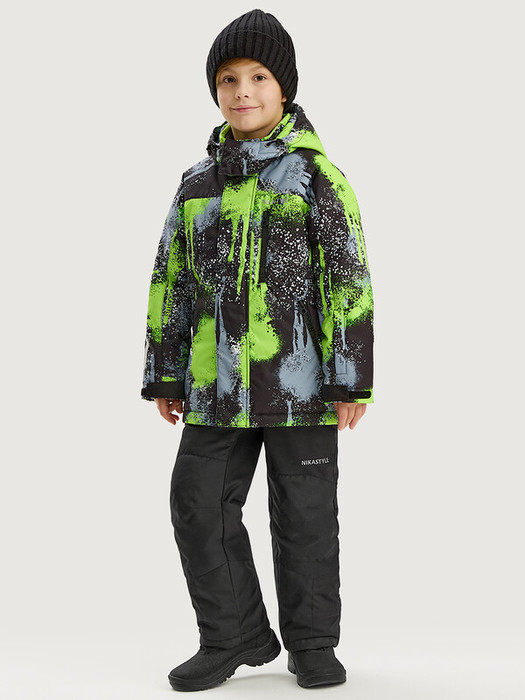 Костюм ГРАФФИТИ из мембранной ткани 5000/5000 с водо-грязеотталкивающей технологией TEFLON. Мембранная ткань это не продуваемый и водонепроницаемый материал, который надежно защищает от ветра и влаги. Благодаря дышащим свойствам мембраны ребенку будет комфортно в любую погоду, и он не вспотеет. Ткань обработана снаружи экологически чистым протектором TEFLON для защиты от воды и грязи. Мембрана в сочетании с утеплителем нового поколения FIBERlite сохраняет тепло во время прогулок, позволяя телу дышать. Флисовая подкладка отводит влагу и имеет хорошие теплоизоляционные свойства.Функционал: - центральная застежка и карманы на молнии, - внутренний карман на молнии, ветрозащитная планка, - съемный капюшон на молнии, - кулиса для регулировки объема по капюшону и по низу куртки, - трикотажные манжеты в рукавах, - внутренние бретели для возможности снять куртку в помещении, - карман на рукаве под ски-пасс, - снегозащитная юбка. Мы все продумали до мелочей, поэтому брюки дополнительно оснащены:- регулируемыми бретелями и отстегивающейся спинкой, - удобными карманами,- снегозащитными муфтами,- регулировкой объема брюк под обувь на молнии, - флисовой подкладкой до середины бедра, - светоотражающими элементами для безопасности ребенка в темное время суток. Область колен и шов сидения проклеены, места повышенного трения выполнены из особо прочной ткани.Комфортная температура эксплуатации от 0°С до -25° С. Рекомендуем приобрести комплектом аксессуары, обувь и другие вещи из капсулы в карточке товара, которые отлично сочетаются с изделиями коллекции