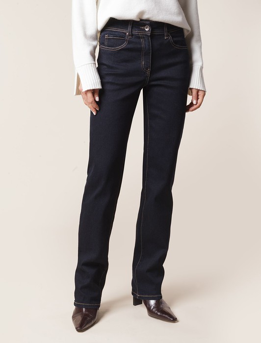 Состав: 80%Хлопок 15%Вис 5%ПУ Плотность: 14.5 OZ Параметры модели на первом фото: Рост 172, бюст 88, талия 64, бедра 88Прямые джинсы выполнены из эластичного денима. Удлиненная модель классического темно-синего цвета с контрастными строчками впишется в любой гардероб. Комфортная посадка на талии подходит для любой фигуры, ткань хорошо тянется и не сковывает движений. На поясе сзади расположен нашивка из эко-кожи с логотипом бренда. Длина изделия позволяет выбрать к образу обувь на каблуке
