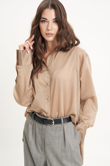 Свободная классического, рубашечного покроя, с цельной застёжкой и воротником-стойкой.Спинка с отрезной кокеткой и мягкой бантовой складкой. Рукав рубашечный с отрезной манжетой на застёжке.