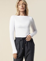Джемпер выполнен из премиального хлопка с добавлением эластана.Гладкий трикотаж обеспечит гарантированный комфорт и удобство в использовании. Внизу изделия металлическая нашивка с логотипом бренда. Совет стилиста: хлопковый джемпер с горловиной формы лодочка – выгодная инвестиция в базовый гардероб. Так как он отлично сочетается с любыми низами, жилетками и кардиганами.