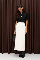 Юбка карандаш выполнена из эластичной поливискозы. Жаккардовое переплетение с геометрическим узором и прямой силуэт визуально стройнят и делают фигуру гармоничной. Мягкое и приятное изделие совершенно не колется и приятное к телу. Сочетайте в костюме с джемпером-поло D39.634 или жакетом D31.388. А также как самостоятельный элемент в комплекте с белой блузкой или светлым жакетом.