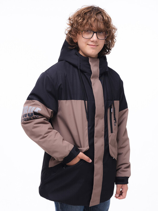 Удлиненная куртка из мембранной ткани с лаконичной черной фурнитурой. Удобная длина, скрывающая школьный пиджак. Центральные части полочек и рукава выполнены из отделочной ткани. На куртке 4 кармана. На левой полочке карман с вертикальным входом. Параллельно ему выполнен лаконичный накат. Под клапанами входы боковые карманы. Внутренний карман накладной на ленте «велькро». Фронтальная молния под ветрозащитной планкой. Ветрозащитная планка и клапаны карманов фиксируются потайными кнопками. Низ рукавов дополнен манжетами на эластичной тесьме и патами с лентой «велькро». Капюшон несъемный. Регулировка лицевой части капюшона выполнена с помощью кулисы со шнуром. На правом рукаве эффектный термопринт.Характеристики:Ткань верха: Liverpool WR membraneПодклад: полибушет / п/э