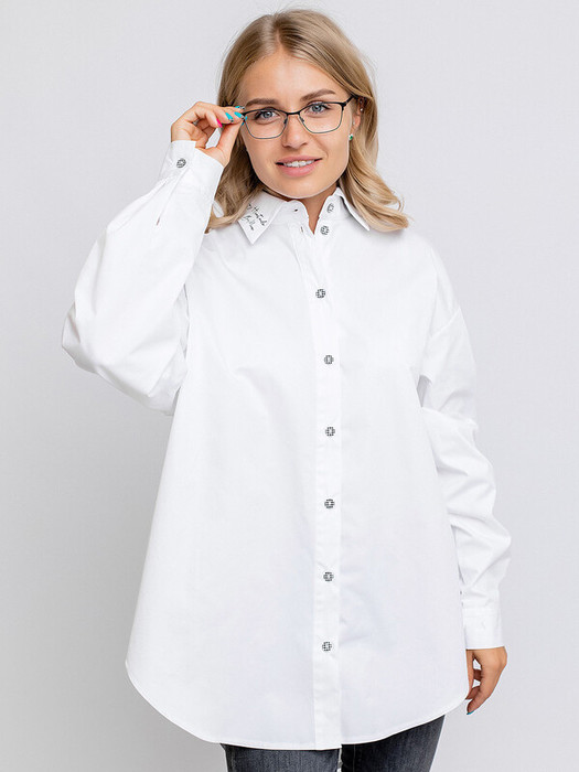 Блузка белая для девочки с длинными рукавами и термотрансфером на воротнике. Застежка на петли пуговицы, отложной воротник. Блузка прямого кроя имеет удлиненный силуэт, подойдет к брюкам. Качественный пошив, сорочечная ткань.Характеристики:Ткань:Сорочечная ткань (60% хлопок, 40% полиэстер) Производитель: batik