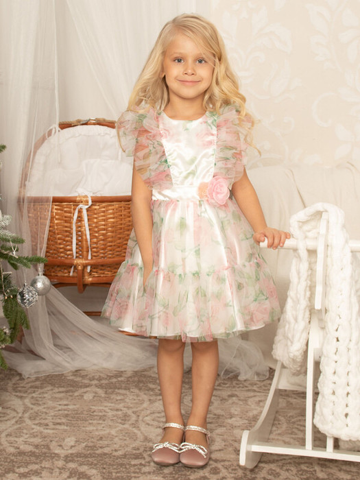 Легкое платье из хлопка с юбкой и трикотажной принтованной сеткой. Ткань верха 100% хлопок, сетка 100% полиэстер. На груди объемные оборки, талия украшена розочками. Юбка пышная с оборкой по низу. Нежный цветочный рисунок. На спинке бант для дополнительной утяжки по талии.Характеристики:Ткань верха: 100% хлопок Сетка - ПолиэстерПроизводитель: batik