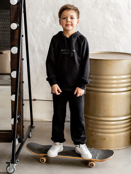 Комплект Пит: худи и брюки для детей из футера черные. Худи с удобным капюшоном и надписью на груди. Со спущенным рукавом и эластичными манжетами, есть карманы. Брюки однотонные на резинке по низу. Комплект Пит подойдет мальчикам и девочкам для прогулок, активного отдыха и путешествий. Характеристики:Ткань верха: футер трехнитка петля 60% хлопок, 40% полиэстерПроизводитель: batik