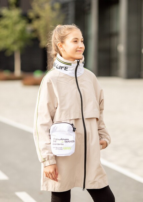 Плащ подростковый Юна для девушек - стильная неутепленная модель с надписями в модных расцветках. Легкий плащ ветровка из новой коллекции Батик подойдет на конец весны и лето.  Особенности: Центральная застежка на молниюВоротник стойка и капюшонЯркая желтая неоновая отделка кантами и фурнитураБонус - небольшая съемная сумка на молнииТермотрансферыХарактеристики:Материал верха: C/N K409 / twill polyПодклад: T/C V-22Утеплитель: нетТемпературный режим: от +10 до +20 СРазмеры: 134-170Производитель: batik