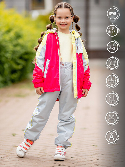 Стильный комплект для девочки Ника представлен в яркой розово-желтой расцветке. Смелое сочетание цветов в комплекте с серыми брюками-джоггерами отлично вписываются в городской стиль. Регулировка объема капюшона и по низу куртки защитит от ветра, а мембранная ткань с водоотталкивающей пропиткой от дождливой погоды. Комплект дополнен светоотражающим декором.   Особенности:  Водоотталкивающая пропитка материала DWR  Регулировка объема капюшона  Регулировка по низу куртки  Регулируемые бретелиСъёмные бретели Светоотражающие элементы и декор Эластичные манжеты рукавовБоковые карманы на кнопкахНиз брюк на резинке Характеристики:Ткань верха: мембранаПодклад: микрофлис Утеплитель: слайтекс 100 - куртка, брюки - 60 Температурный режим от +5 до -10 СПроизводитель: batik