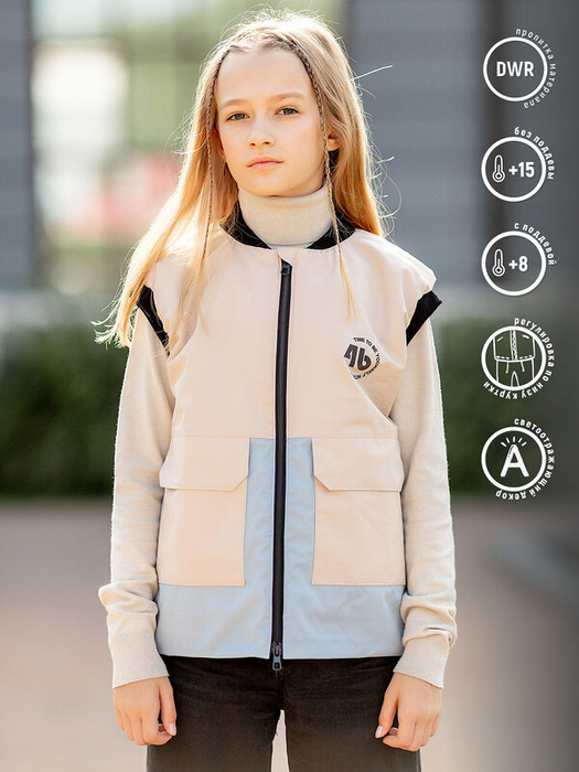Жилет Кейси для детей серо-синий из комбинированной ткани. Детский жилет из футера и курточной ткани с разъемной молнией. Легкий и теплый жилет на весну и лето без утеплителя. Проймы и горловина из эластичного трикотажа позволяют жилету плотно прилегать к телу и сохранять тепло. Особенности: Сочетание двух тканей и цветов (колор-блок)Регулируемый капюшонНакладные карманы Трикотажный воротникРегулировка по низу Характеристики:Ткань верха: Футер с начесом / курточная ткань Утеплитель: без утеплителя Температурный режим от +8 (с поддевой) до +15 (без поддевы)Производитель: batik