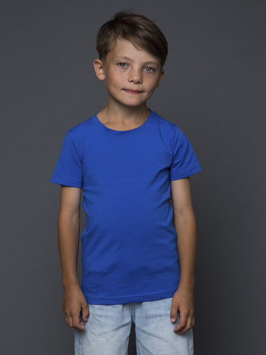 Яркая детская футболка синего цвета с коротким рукавом.