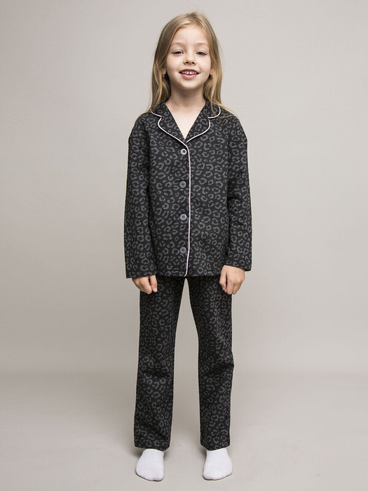 Детский пижамный комплект для девочки из супрема пенье. Футболка с длинным рукавом и удобные брюки. Черный цвет с модным леопардовым принтом. Футболка с милыми пуговичками спереди. Мягкая резинка на брюках для комфортного сна. Воздухопроницаемая ткань премиального качества.Характеристики:Ткань: Футер 2х нитка пенье 100% хлопокПроизводитель: batik