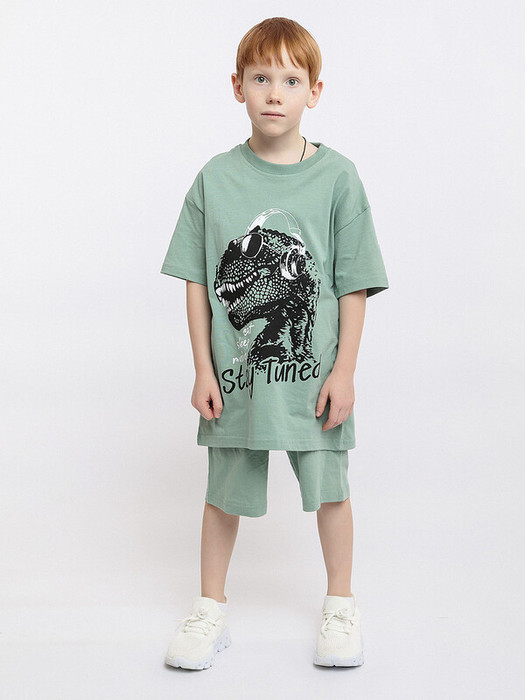Комплект для мальчика трикотажный из супрема: футболка и шорты в зеленом цвете. Костюм с шортами - идеальный вариант для активного отдыха, спорта и повседневной носки. Футболка и шорты изготовлены из легкого и мягкого трикотажного хлопка, приятного на ощупь и дышащего. Футболка с короткими рукавами, спущенной линией плеча и принтом в виде динозавра.Характеристики:Ткань: Супрем - 100 % хлопокПроизводитель: batik
