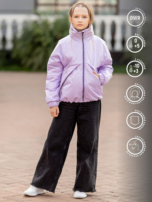 Куртка для девочки Ася в стиле спорт-шик с перламутровым эффектом в лиловой расцветке. Капюшон-трансформер сворачивается в воротник, а спереди прорезные карманы на молнии. Курточная ткань с водоотталкивающим покрытием DWR. На рукавах стеганные манжеты на резинке.   Особенности:  Водоотталкивающая пропитка материала DWR  Регулировка объёма капюшона Внутренний карманСветоотражающие элементыВысокий воротник Характеристики:Ткань верха: Курточная с перламутровым покрытиемПодклад: полиэстер Утеплитель: 100 гр Температурный режим от +5 до -10 СПроизводитель: batik