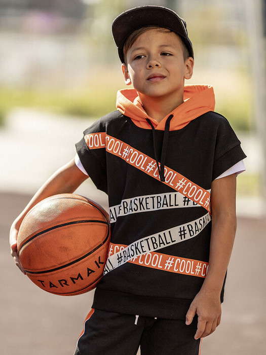 Жилет для мальчика из футера черно-оранжевый с рукавами и капюшоном. Принт с надписями.