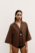 Необычная удлиненная блузка строго силуэта. Рельефные швы от горловины, неровная линия низа, широкие подгибки и планка, выделяют эту блузку из всех других