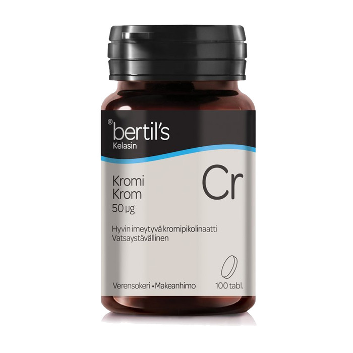 Быстроусваеваемый Пиколинат Хрома Bertil`s Хром — отличный препарат для увеличения потребления хрома. Хром необходим для сбалансированного метаболизма сахара, где он работает в сотрудничестве с инсулином. Исследования показывают, что хром улучшает чувствительность рецепторов к инсулину, что приводит к снижению уровня сахара в крови. Снижение чувствительности к инсулину является одним из важных симптомов диабета II типа. Цель использования: Для балансировки метаболизма сахара Кому: Для женщин и мужчин всех возрастов Для тренирующихся и активных спортсменов Для тех, кто следит за уровнем сахара Для сладкоежек Состав: наполнители (кукурузный крахмал, мальтодекстрин на основе кукурузы, порошок целлюлозы), пиколинат хрома, эмульгатор, магниевые соли жирных кислот. Дозировка: 1 таблетка в день. Количество действующих веществ/1 таблетка: Хром 50 мкг (125%*) *от рекомендуемой дозы суточного потребления