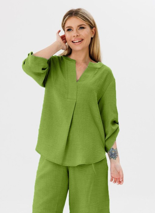 Блузка женская прямого силуэта с притачным рукавом. По переду V-образный вырез с притачной планкой и складкой. Рукав на пате. Низ фигурный.