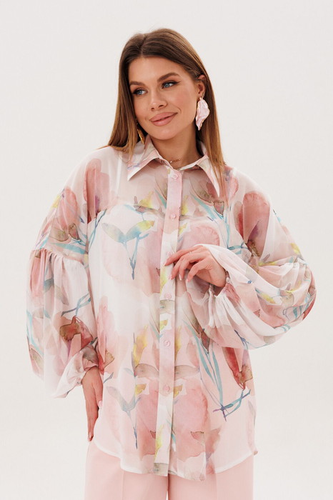 Блузка рубашечного типа, свободного силуэта, со спущенной линией плеча. По переду застежка на петли пуговицы. Рукава обьемные (буфы), по низу рукава резинка.