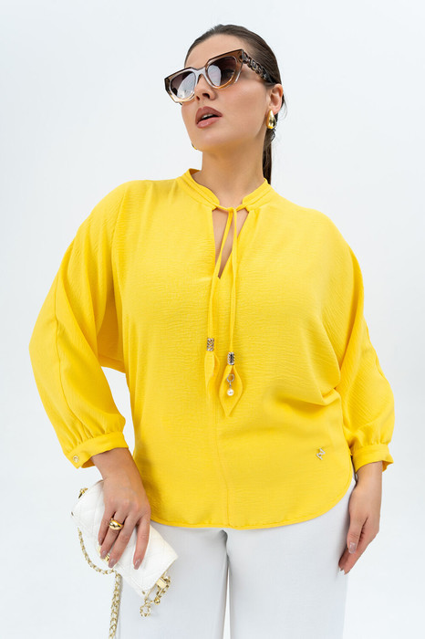 Блузка женская как для праздников так и для любого мероприятия , покроя "летучая мышь" , со стойкой на которую настрочена завязка с декоративными элементами , со швом по центру полочки, рукава цельнокроёные, застёгивающиеся на петлю и пуговицу. Низ блузки по спинке длиннеее, по полочке короче.