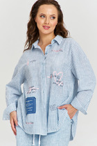 Длинные втачные рукава свободного кроя украшены сборкой по низу и декоративными завязками, добавляя нотку игривости и оригинальности. Воротник-стойка, отделанный бархатной тесьмой, придает блузе особый шарм и утонченность.