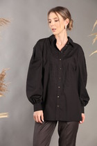 Прямой силуэт, втачной рукав, рубашечный воротник на стойке, функциональная застёжка на пуговицы по всей длине.