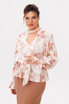 Блуза свободного кроя. Выполнена из лёгкого натурального полотна рами. Вырез горловины V-образный. По переду регулируемая кулиска. Рукав цельнокроеный. Длина рукава от горловины 46 см. Длина спинки 72 см