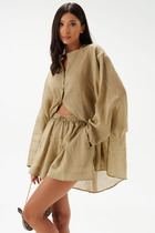 Блузка из текстильного полотна нежно- розового цвета, свободного кроя.Горловина овальная. Застежка на шнурки- завязки. Отрезная спинка со сборкой.Рукав свободный, присборен на резинку. Перед отрезной со сборкой. Длина по спинке 65 см, длина рукава 75 см