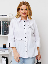 Блуза удлиненная из текстильной ткани, свободного силуэта. Застежка центральная на петли-пуговицы. Воротник отложной на стойке. По переду обработаны кокетки и вертикальные рельефы от нее. По левой полочке в области груди небольшой настрочной карман. Спинка с кокеткой. Рукава укороченные, втачные, с патой. Длина рукава 46 см, длина по спинке 86 см.