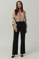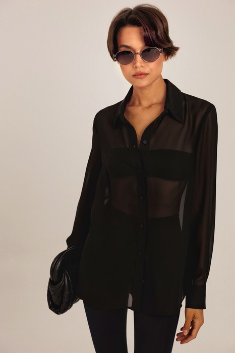 Блузка женская из шифона прямого силуэта. Борт обработан притачными планками. Воротник отложной на стойке. По переду имеются нагрудные вытачки. Рукав втачной одношовный с манжетой по низу. Застежка на пробивные петли и пришивные пуговицы.