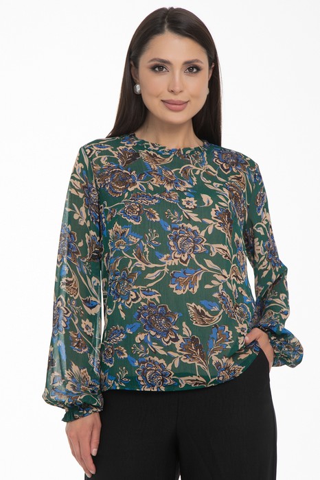 Очаровательная свободная шифоновая блузка, подчеркивающее женственность - отличное решение на каждый день или на праздник для современной стильной женщины. Шикарная модель с объемными длинными рукавами выполнена из высококачественного шифона. Круглая горловина оформлена рюшей с застежкой на пуговицу на спине.Нежная блузка из шифона на трикотажном подкладе, по переду сделаны вытачки на грудь, рукава втачные пышные, длинные, снизу собраны на резинку.