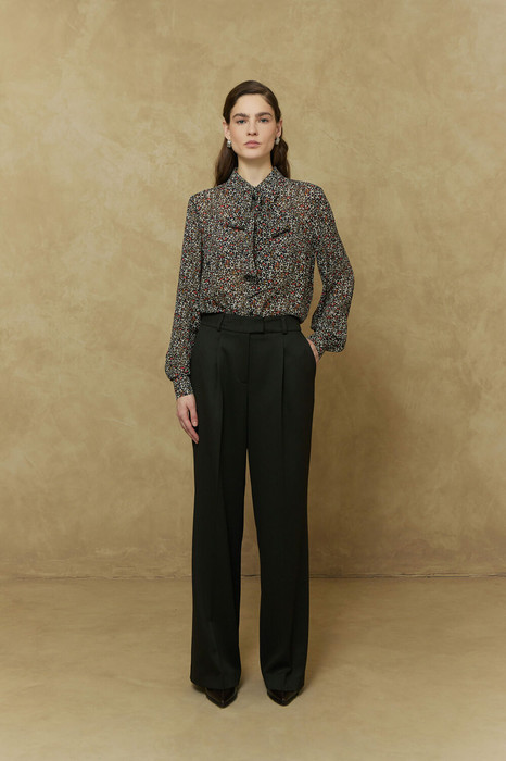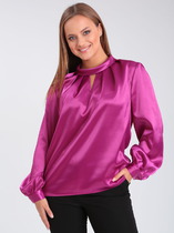 Блузка женская прямого силуэта. Воротник стояче-отложной. Застежка по планке переда на петли и пуговицы. Спинка с кокеткой, со встречной складкой. По боковым швам разрезы. Рукав втачной, с притачной манжетой, застегивающейся на петли и пуговицы. Воротник рубашечного типа. В комплекте обтачной бант.