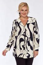 Блуза свободного силуэта, выполнена из легкой струящейся ткани с модным принтом. По переду заложена складка для свободы движения. На спинке горизонтальный подрез с встречной складкой. По боковым швам у блузы разрезы. Рукав втачной одношовный с манжетой. Застегивается рукав на 2 петли и пуговицы.